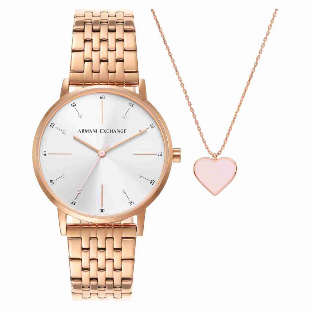 Tags: Armani Exchange, Necklace Set, Rose Gold-Tone, Stainless Steel, Three-Hand, Watch