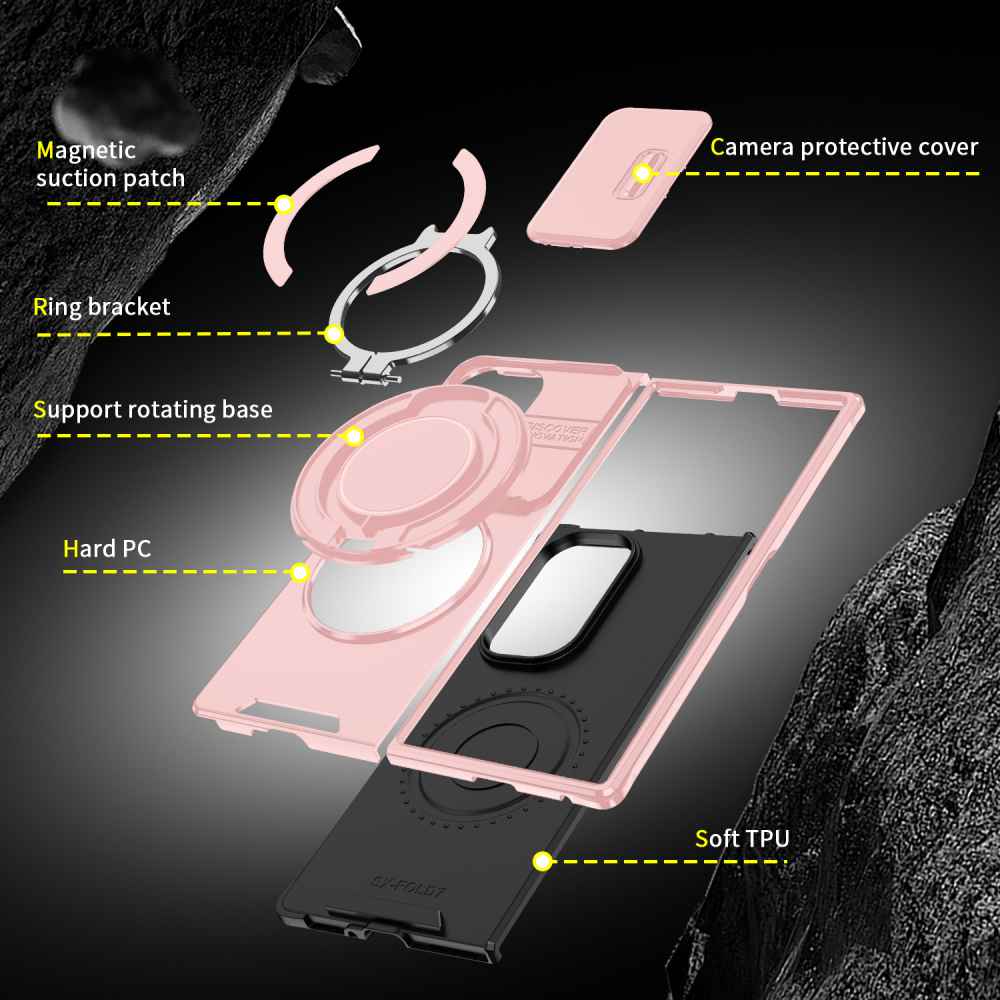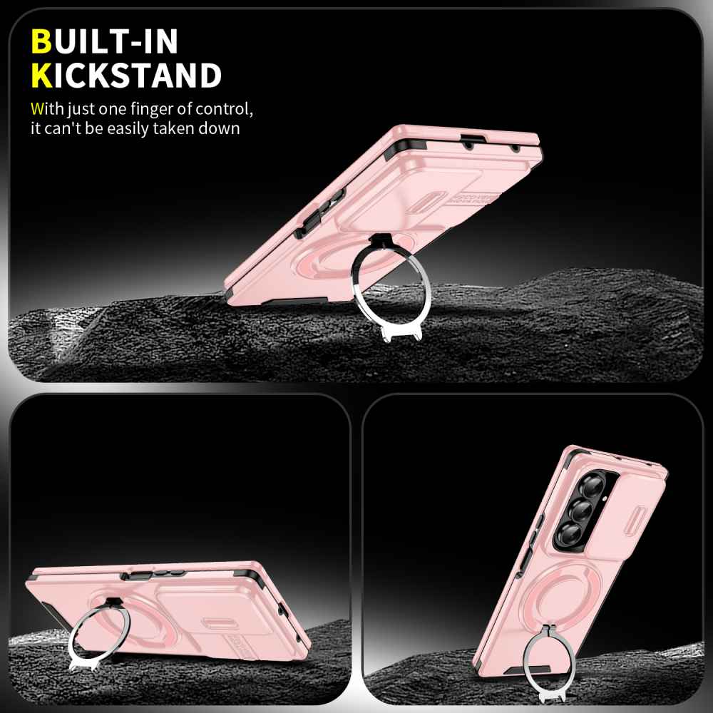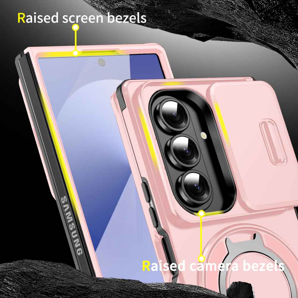 • Keep your Galaxy Z Fold 7 safe and functional with this rugged magnetic case. Featuring reinforced corners and raised bezels for superior drop protection, it also includes a built-in 3600 rotating ring stand for easy hands-free viewing and secure grip. The strong magnetic back is compatible with car mounts and wireless charging setups.